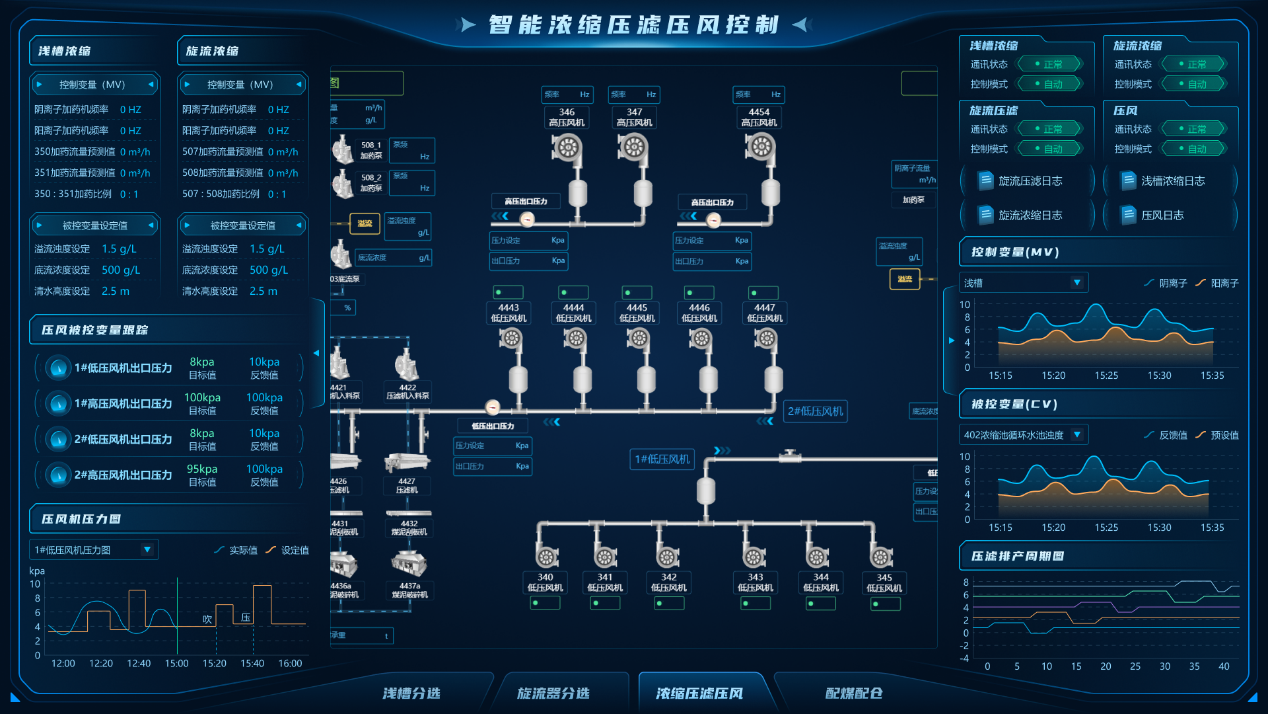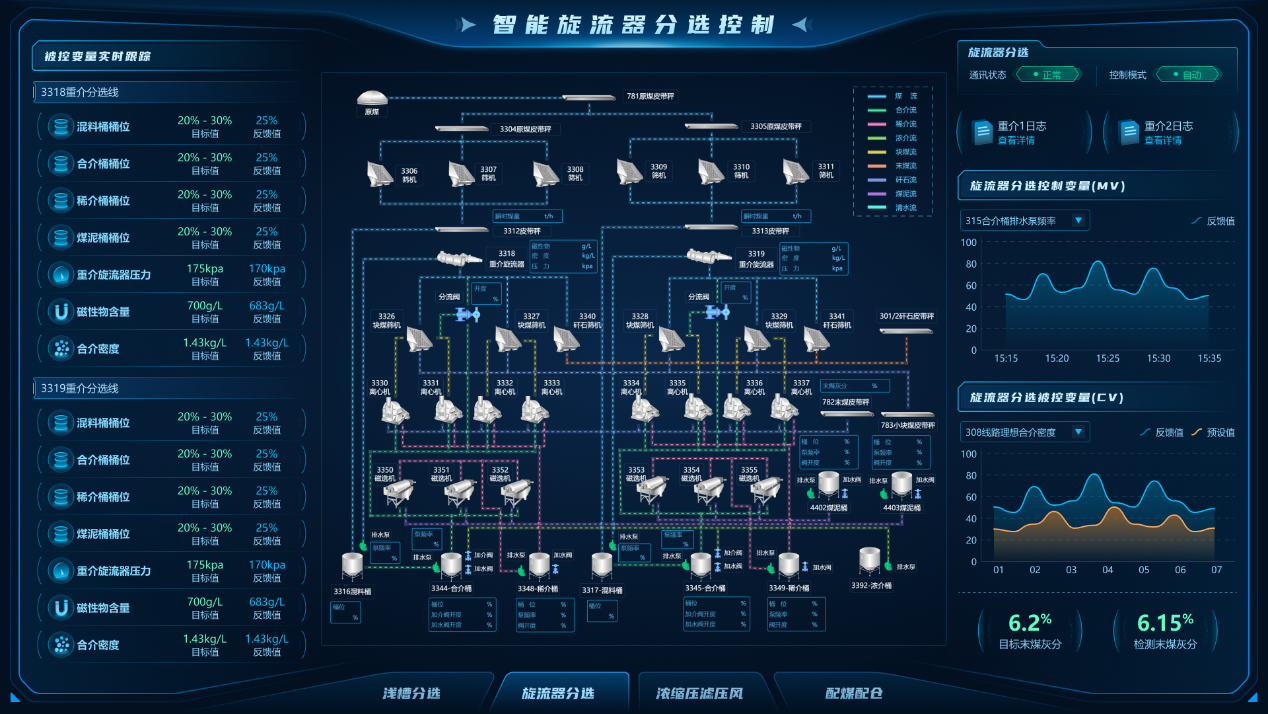 “數(shù)據(jù)-模型雙驅(qū)動的選煤廠智能控制與決策系統(tǒng)的研究與應(yīng)用”項(xiàng)目研發(fā)了“數(shù)據(jù)-模型雙驅(qū)動”的選煤廠控制系統(tǒng),融合模型預(yù)測控制(MPC)、無模型自適應(yīng)控制(MFAC)與多輸入多輸出預(yù)測模型控制,實(shí)現(xiàn)了重介分選、濃縮壓濾、精準(zhǔn)配煤等環(huán)節(jié)的毫秒級閉環(huán)控制。